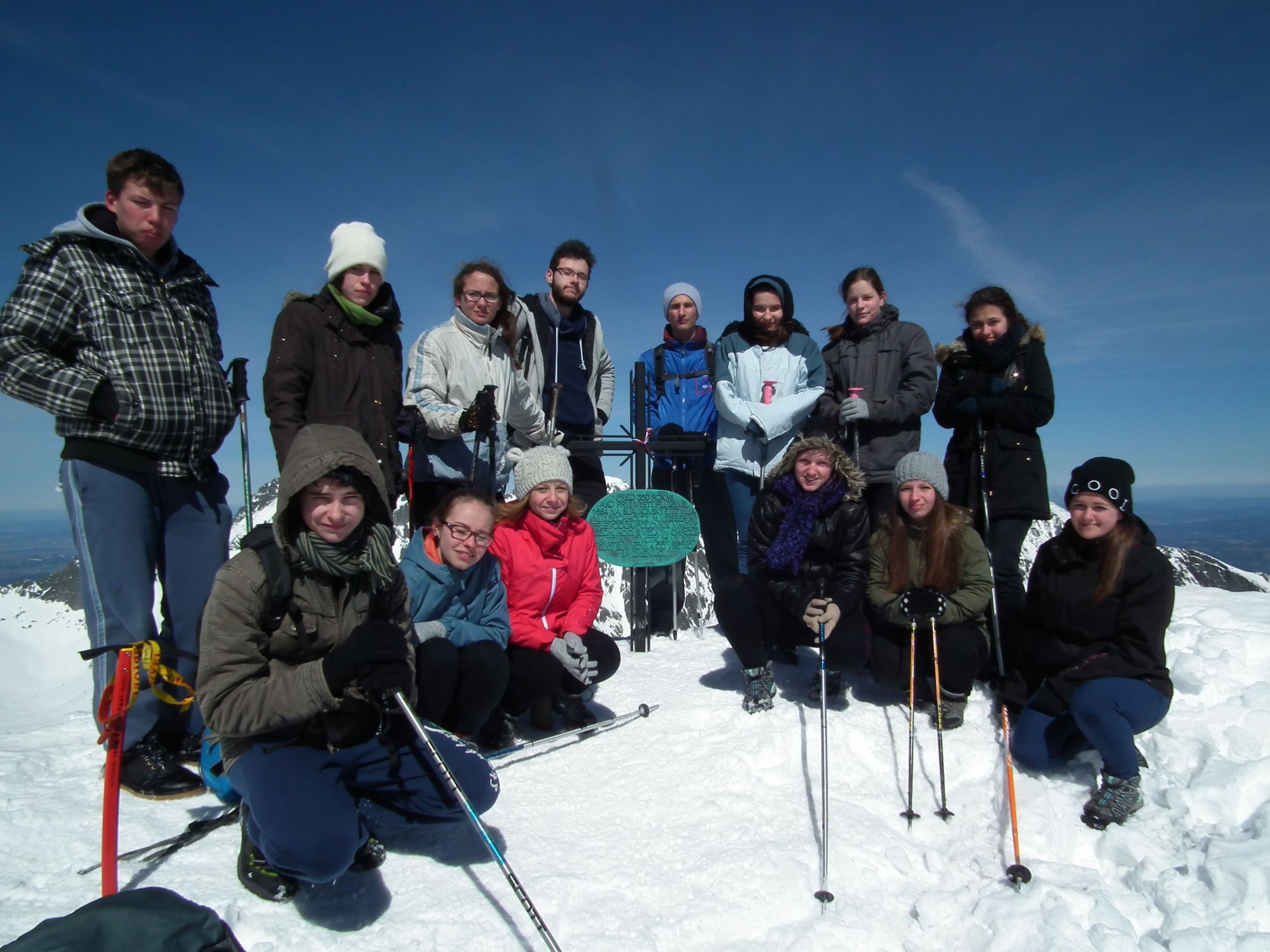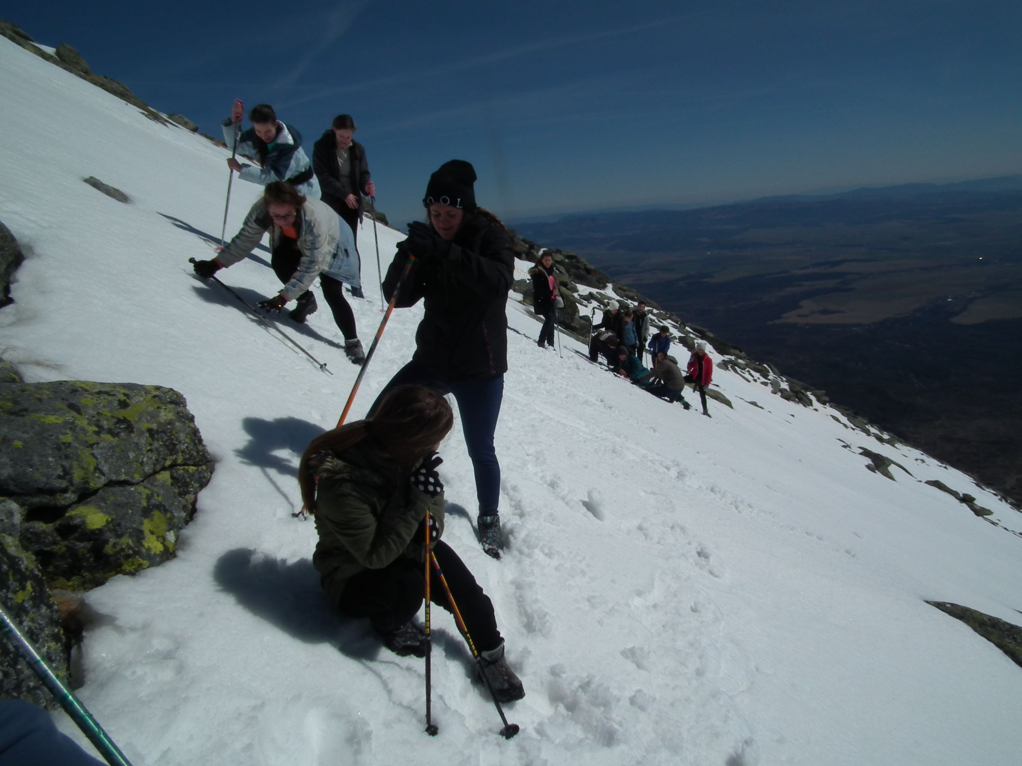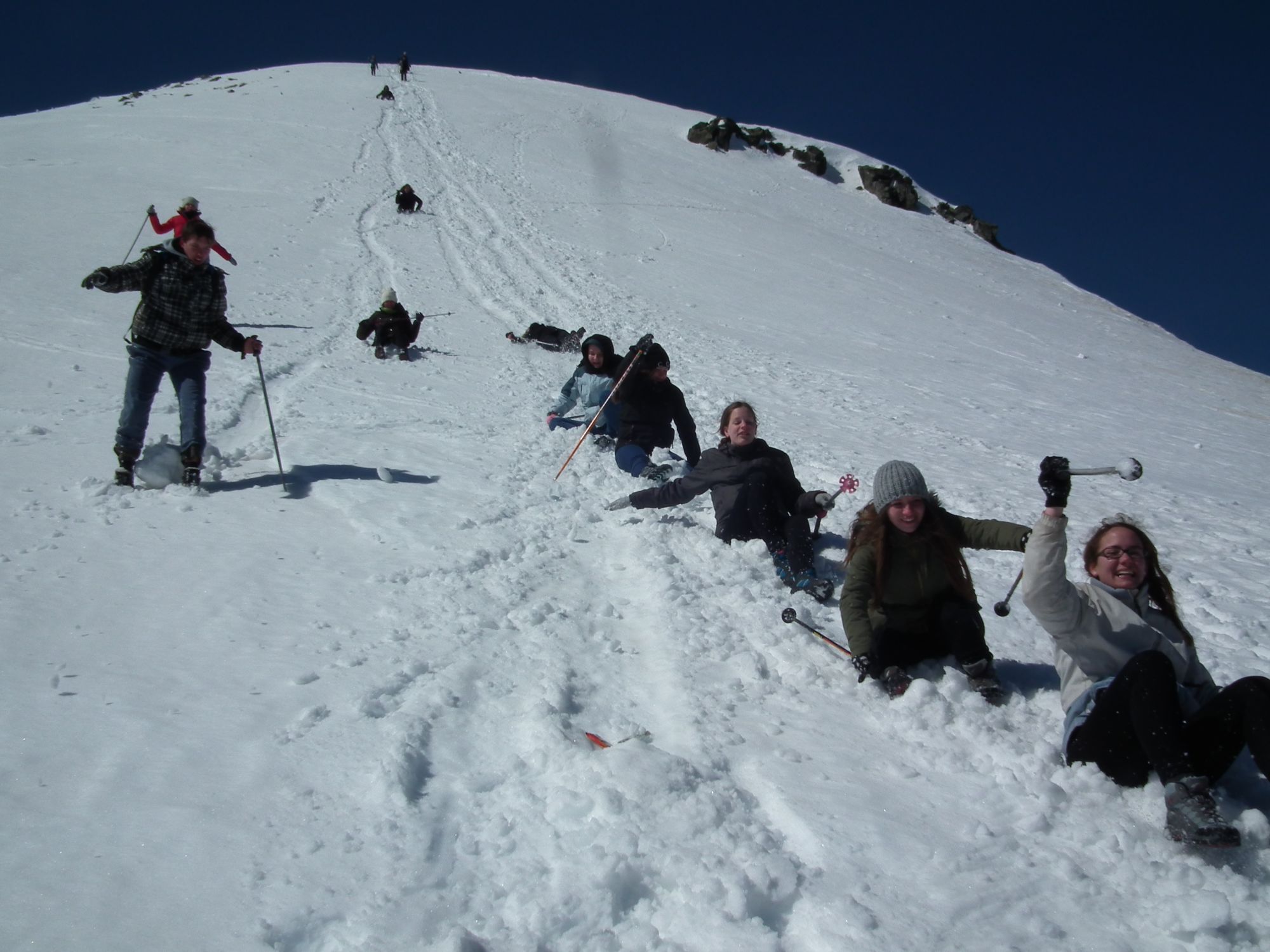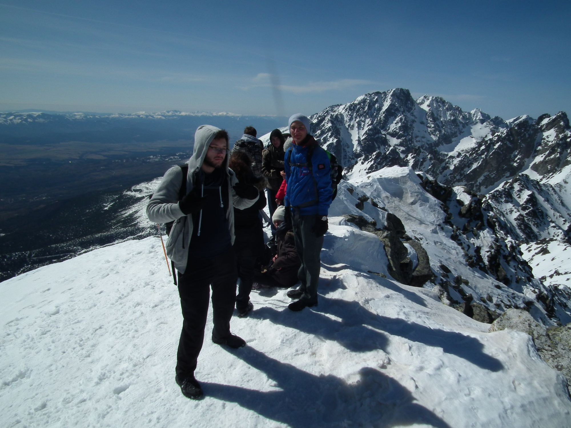 Szombaton következhetett túránk legjobban várt szakasza, a Nagyszalóki-csúcs 2452 méterének megmászása. A tervek szerint délután egykor értünk volna vissza a menedékházhoz, ez sajnos nem jött be, ugyanis pontosan egyre értünk fel a csúcsra. Az oda vezető utunk sem volt sima, a mély hó, a hóban alattomosan megbújó törpefenyők és a helyenként jeges, meredek lejtők együttesen igencsak megnehezítették haladásunkat. De a látvány mindenért kárpótolt! Gyönyörű kilátásunk nyílt a Poprádi-medencére, és a távolban hosszan elnyúló Alacsony-Tátrára. A csúcson elénekeltük a Himnuszt, és nem győztünk betelni a 360 fokos panorámával. A lefelé jövet már kissé kellemesebb lett, sokszor tudtunk fenekünkön csúszva rövidíteni, és még Koprivanacz Peti leváló bakancstalpának kérdését is megoldottuk. Végül délután 5-re értünk vissza a menedékházba, ahonnan még lesétáltunk aznap esti szállásunkra, Ótátrafüredre, itt egy finomat vacsoráztunk, és szomorúan vettük tudomásul, hogy mindenki piszkosul leégett.